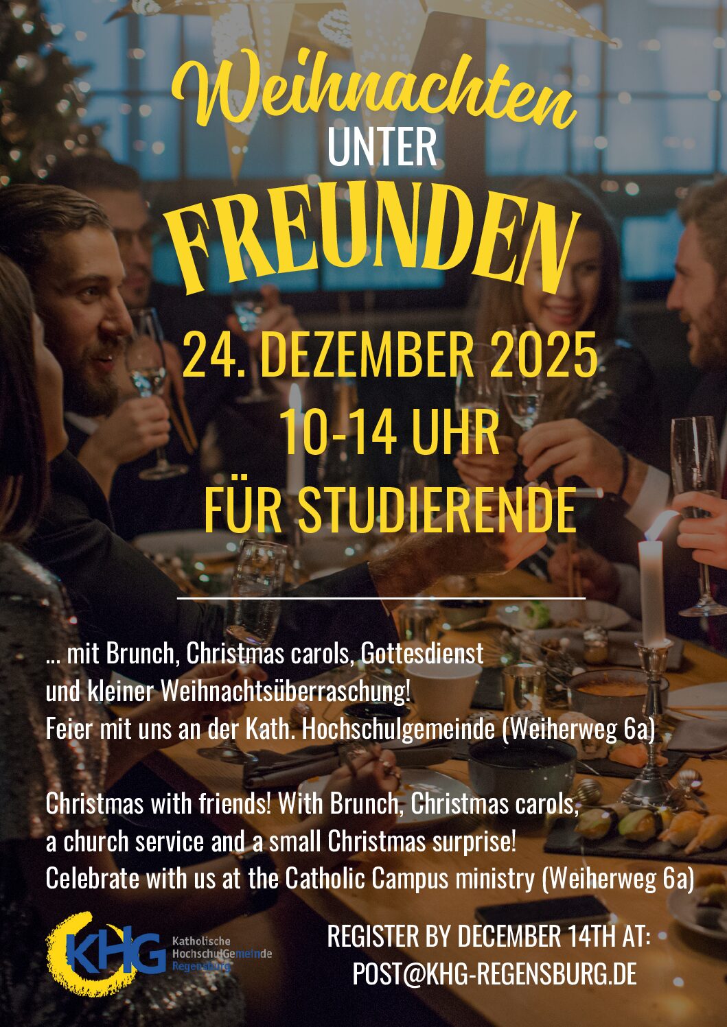 Christmas with friends! With Brunch, Christmas carols, a church service and a small Christmas surprise! Celebrate with us at the Catholic Campus ministry! Register at post@khg-regensburg.de