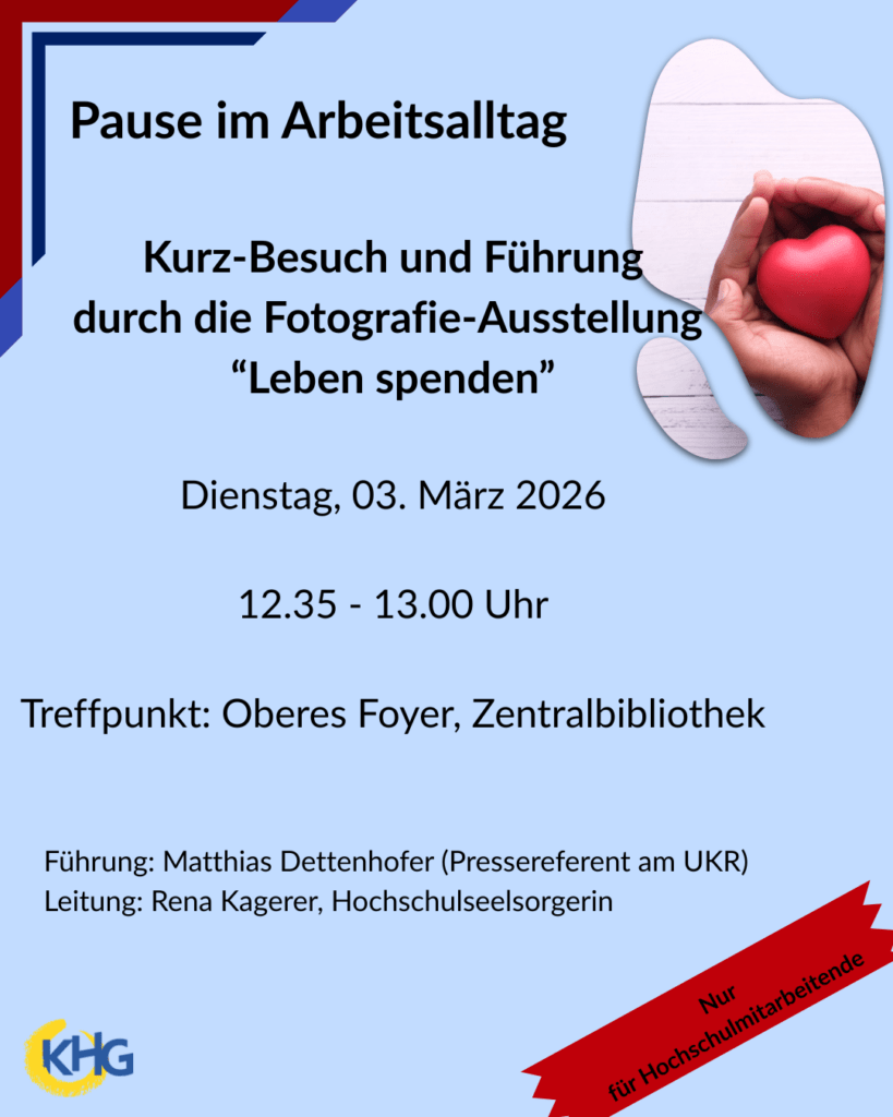 Die Fotografie-Ausstellung „Leben spenden“ schafft durch ihre Bilder einen ganz besonderen Zugang zum Thema Transplantationsmedizin und eine spürbare Nähe zu den Betroffenen von Organspende. In einer Kurz-Führung wird uns Herr Matthias Dettenhofer (Pressereferent am UKR) durch die Ausstellung begleiten. Alle Lehrenden und Mitarbeitenden der Universität Regensburg sind herzlich zu diesem Angebot eingeladen.