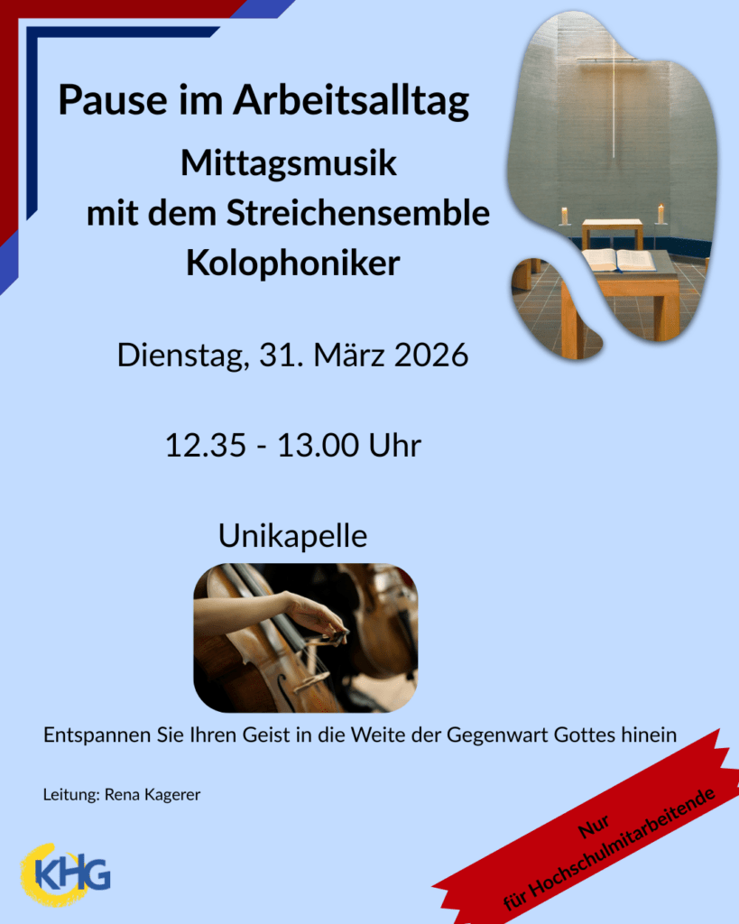 Das Streichensemble Kolophoniker spielt heute die Mittagsmusik in der Unikapelle und lädt sie zu einer 20minütigen Pause ein, in der Sie aus dem Arbeitsalltag aussteigen und sich von den Klängen berühren lassen dürfen.