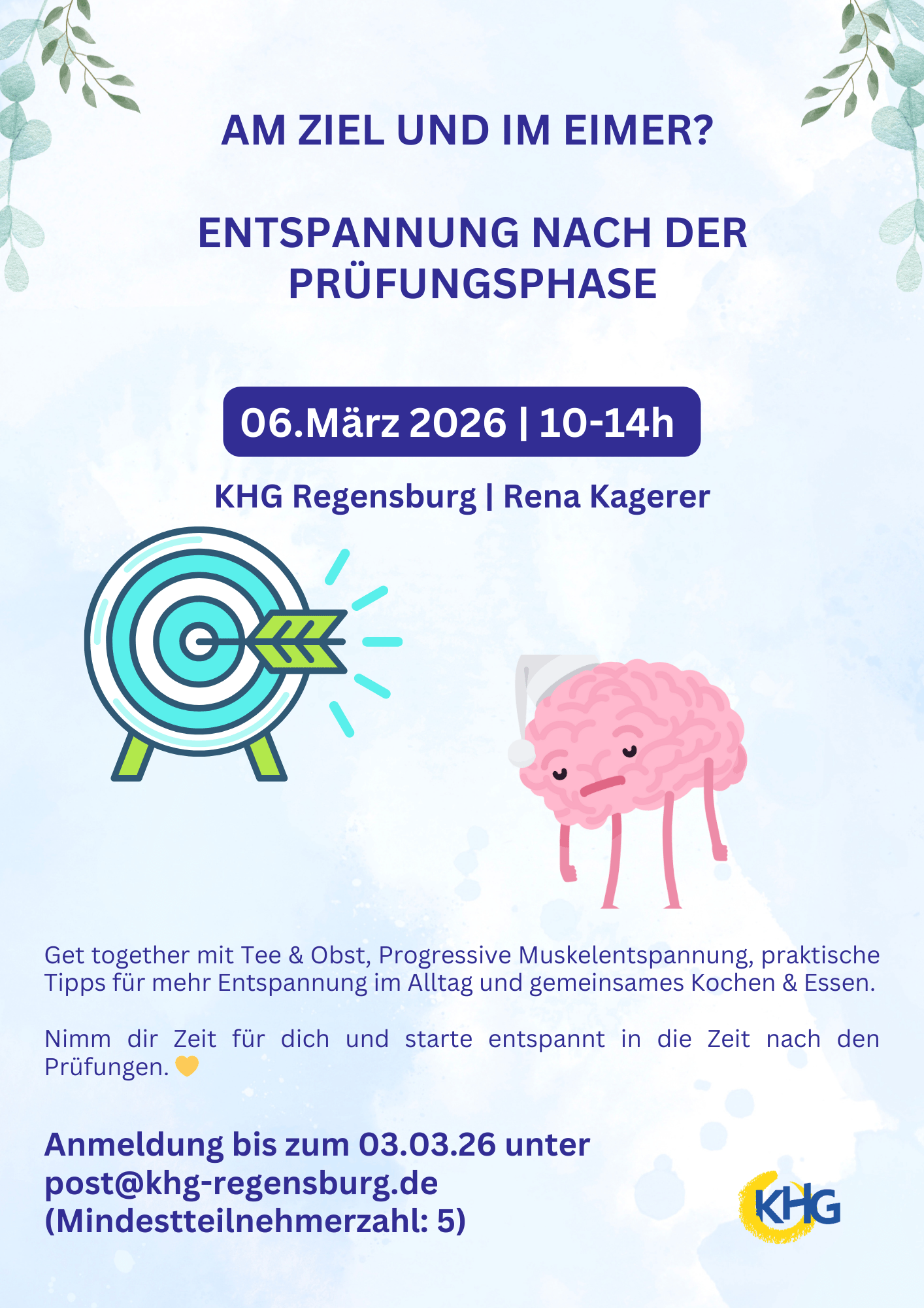 Wir laden dich in der KHG ein zum Runterkommen: Get together mit Tee & Obst, Progressive Muskelentspannung, praktische Tipps für mehr Entspannung im Alltag und gemeinsames Kochen & Essen. Nimm dir Zeit für dich und starte entspannt in die Zeit nach den Prüfungen. 💛