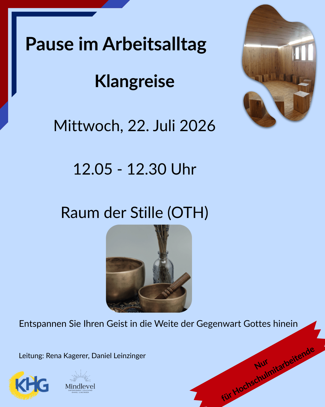 Gönnen Sie sich eine meditative und entspannte Mittagspause! Wir laden alle Mitarbeitenden der OTH herzlich zu einer Klangreise in den Raum der Stille ein. Nach einem kurzen Einstieg, der uns und unseren Körper zur Ruhe bringt, legen Ihnen die Klänge von Handpan, Ocean-Drum und Klangschalen einen sanften Klangteppich. Diese Auszeit erholt Körper und Geist, um anschließend wieder erfrischt an die Arbeit gehen zu können.