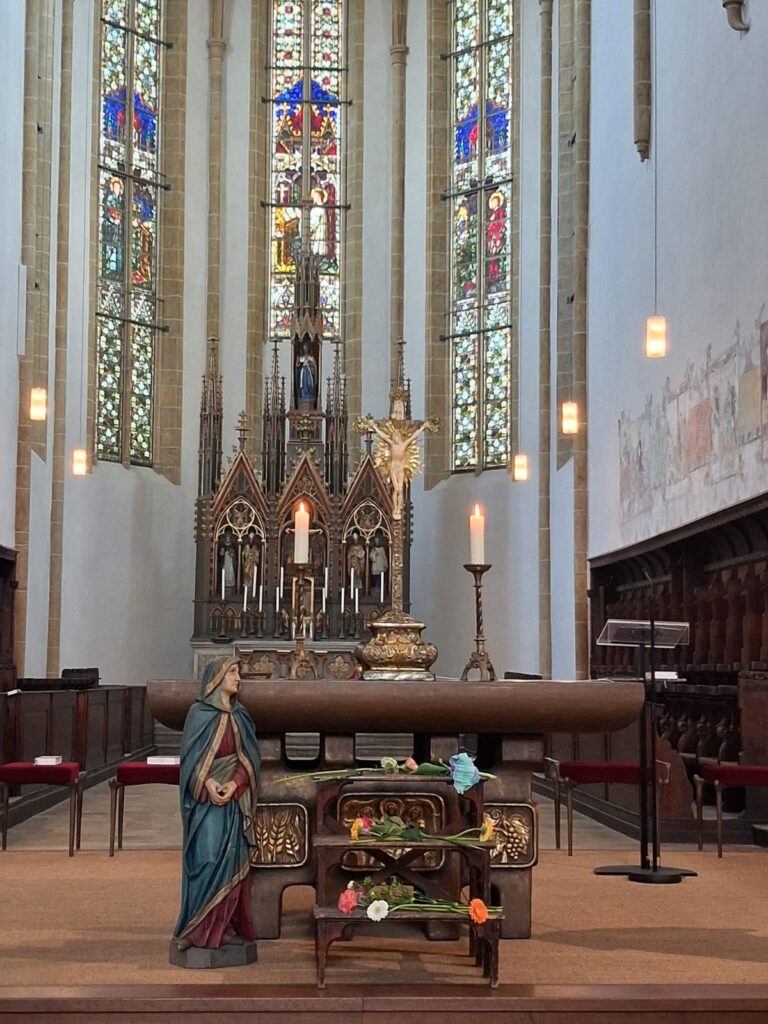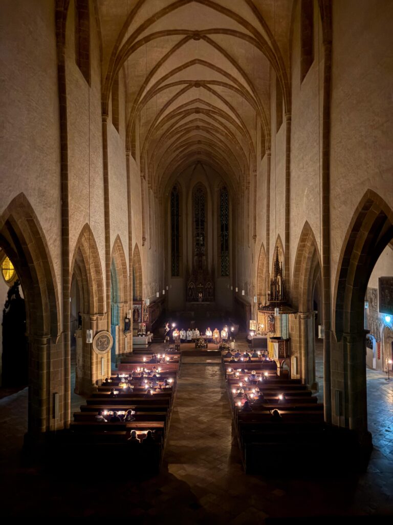 In den vergangenen Tagen feierte die Katholische Hochschulgemeinde in der Dominikanerkirche St. Blasius die Liturgien der Hl. Woche. Vom Einzug Jesu in Jerusalem am Palmsonntag, über die Feier des Letzten Abendmahles am Gründonnerstag, die Passion Jesu am Karfreitag, bis hin zur Auferstehung in der Osternacht wurde in den verschiedenen Gottesdiensten das Handeln Gottes im Lebensschicksal Jesu vergegenwärtigt.